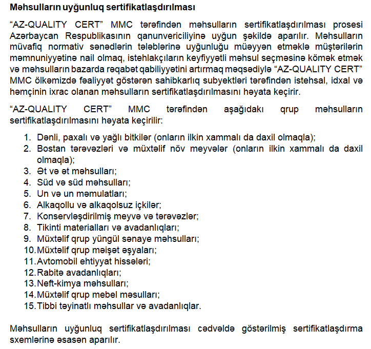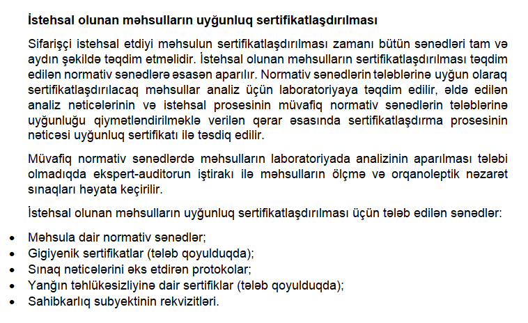 ✔ İSTEHSAL OLUNAN MƏHSULLARIN UYĞUNLUQ SERTİFİKATLAŞDIRILMASI